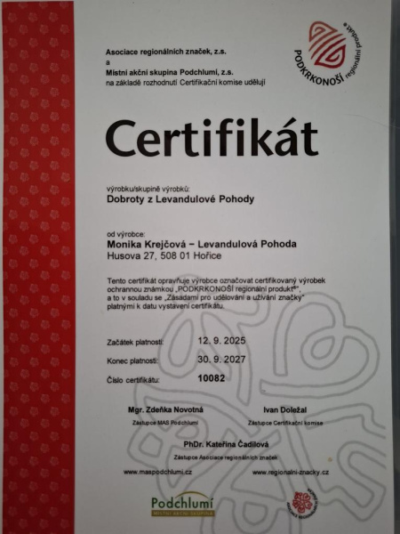 Levandulku-/Bio kvalita/, kterou používám, pochází od regionálního pěstitele, který je taktéž držitelem regionální produkt Podkrkonoší.