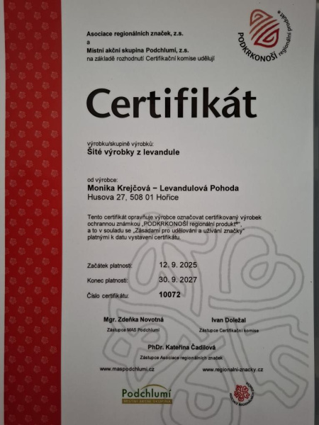 Jsem tu pro Vás a těším se na společné objevování této kouzelné bylinky-levandule. Šité výrobky s levanduli -jsou oceněny regionální značkou MAS Podchlumí-regionální produkt Podkrkonoší a jejich výroba je podpořena Královehradeckým krajem. Všem moc děkuji za podporu.